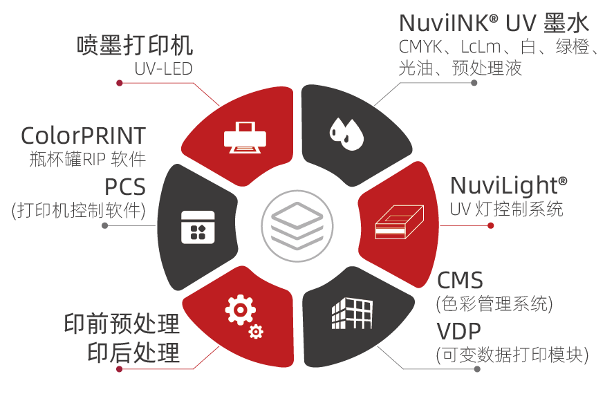 UV燈的照射區域被分為若干部分,每一個部分都可被單獨地掌控激活。此功能可實現同期打印白墨、彩墨和光油,并呈現完美的亮光效果。當需要用光油打印時,與以前的技術相比,打印生產率平均加強了50% 以上。
