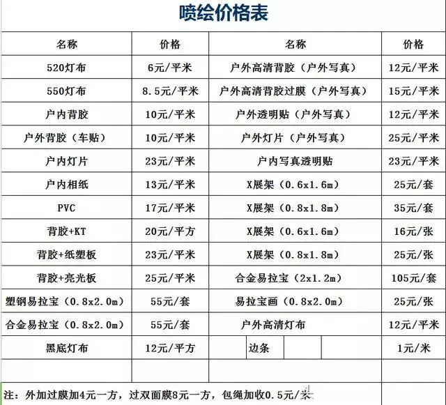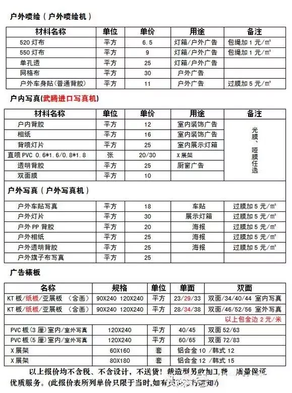 按平方米計價,打印費+材料費,非常多UV工藝制作商通常都是來料加工。下面是兩家宣傳機構的報價單,大眾能夠參考下(僅供參考)